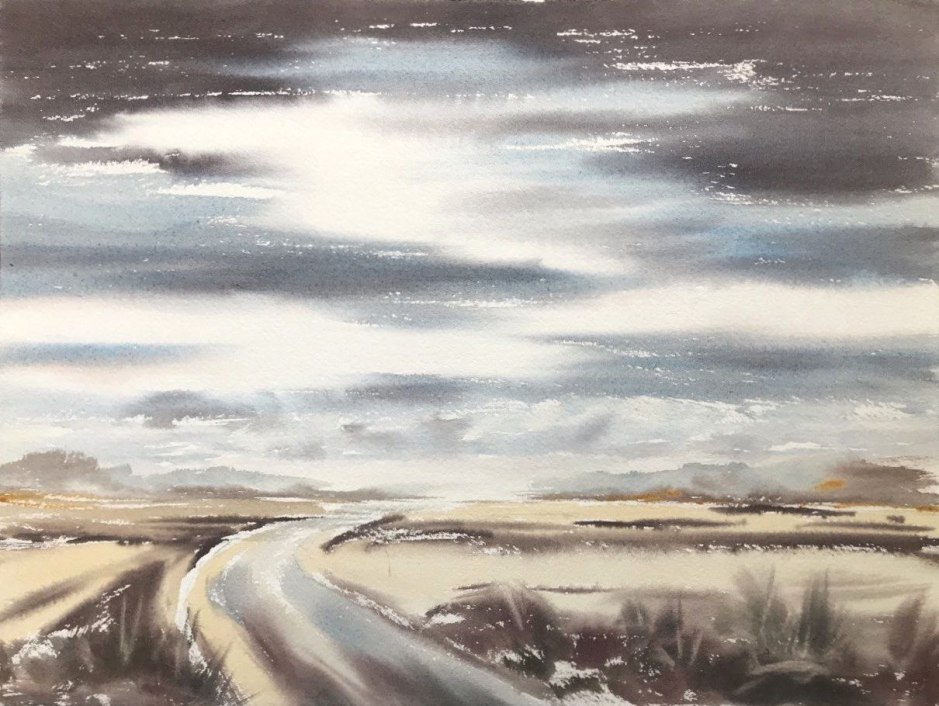Original watercolor painting featuring a quiet winding road through an open landscape under a dramatic, light-filled sky. This piece captures a peaceful sense of movement and stillness at the same time — the road gently leads the eye into soft fields, distant land, and layered clouds. Painted in a wet-on-wet watercolor approach, the artwork has airy transitions, subtle texture, and a calm, contemplative mood.
