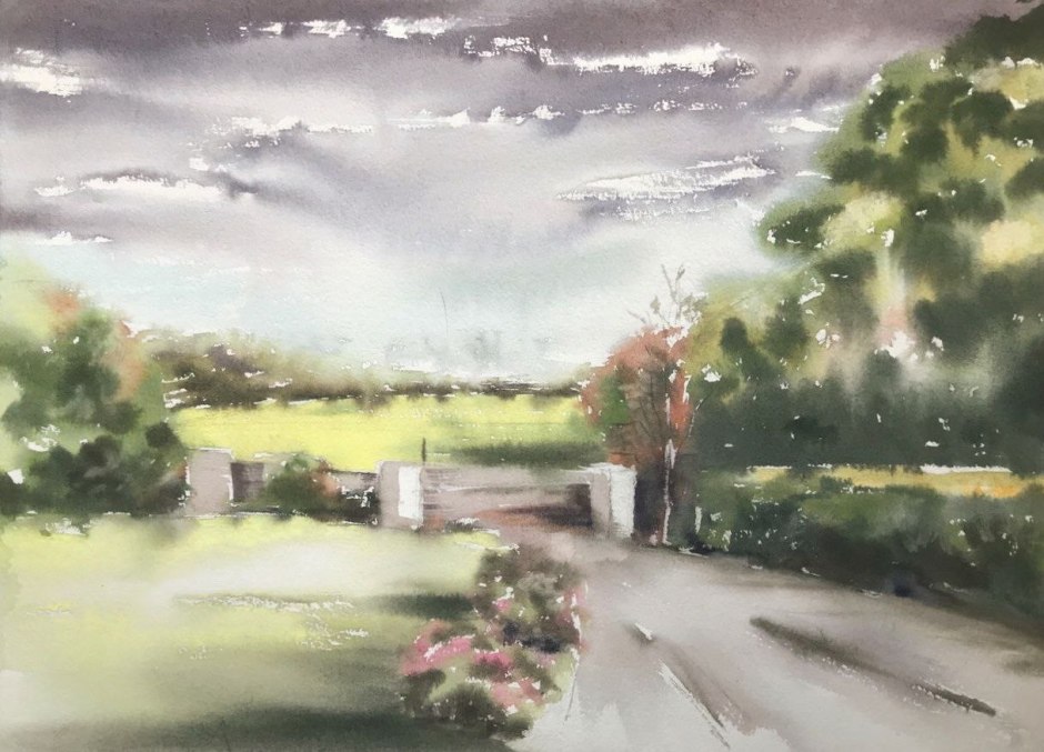 This piece captures a quiet country road, soft green fields, and a dramatic sky just before or after rain — a peaceful everyday moment seen from home. Painted in a wet-on-wet watercolor technique, it has gentle transitions, luminous light, and an atmospheric softness that brings a deeply personal and calming mood to the artwork.