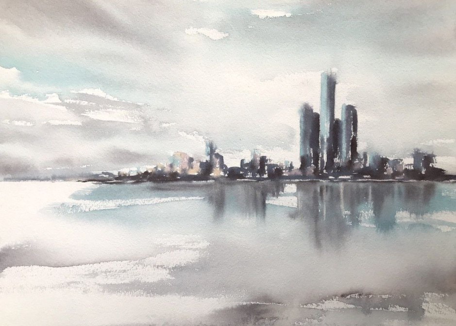 Original watercolor painting of a quiet city skyline reflected across still water in soft, luminous tones.