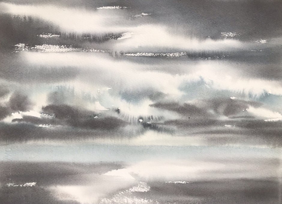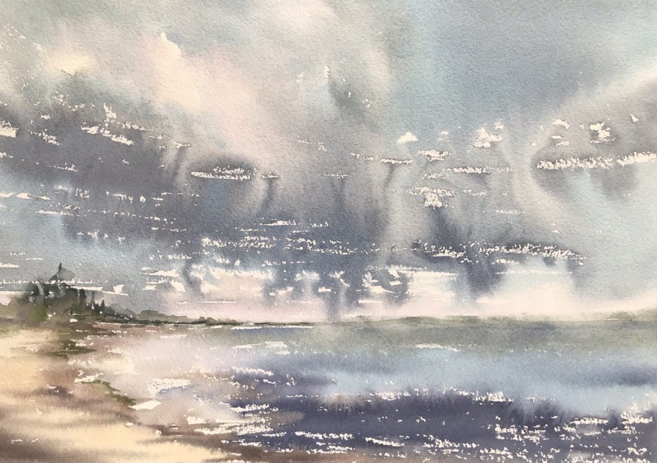 Original watercolor painting with luminous sky reflections, soft shoreline light, and a calm, atmospheric horizon. This piece captures a quiet coastal moment where water, sky, and light blend together in delicate wet-in-wet transitions. The dramatic cloud movement and shimmering highlights create a peaceful yet expressive mood, making this painting a beautiful statement for a serene interior.
